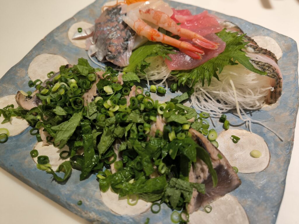 そこで購入した鰹の藁焼きに薬味をたっぷりと掛け、