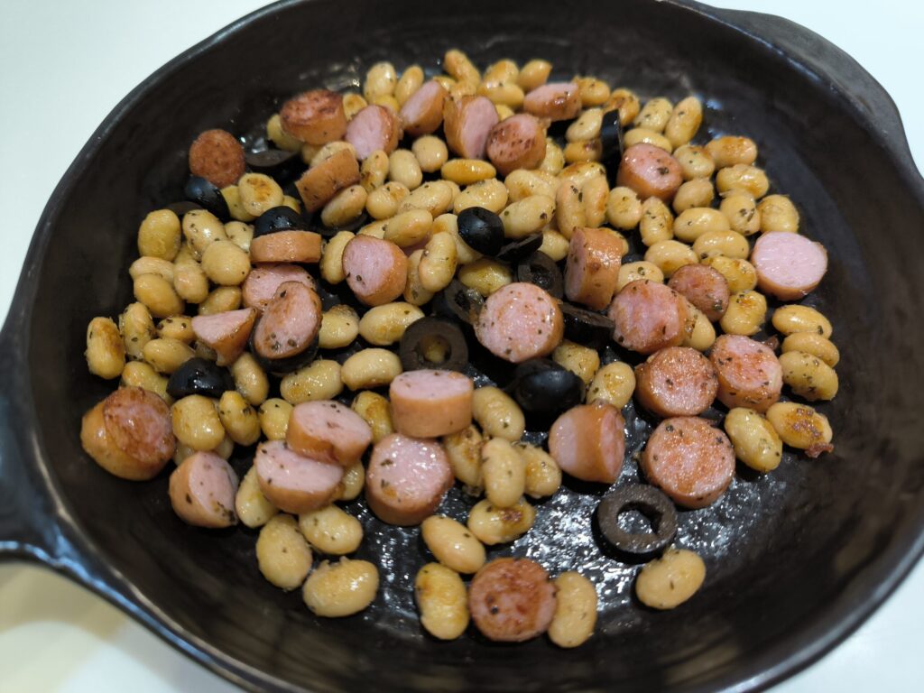 今日のおつまみは【大豆とソーセージのガーリック炒め】です。