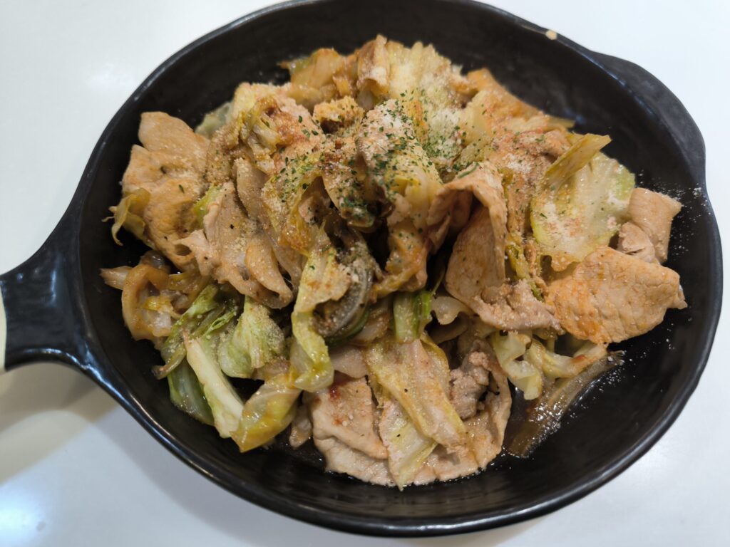 豚こま肉とキャベツを弱火で蒸す様にフライパンに蓋をして焼き、