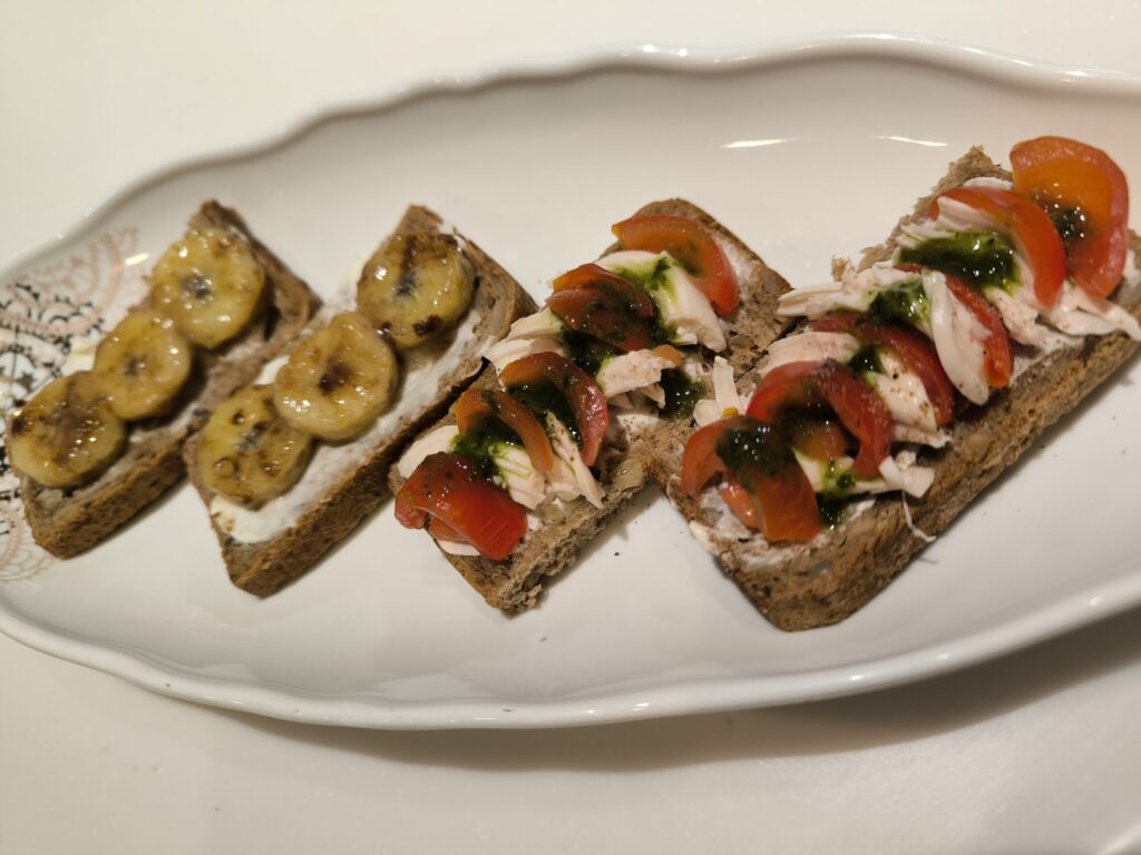 全粒粉的な薄切りのパンにクリームチーズを塗り、